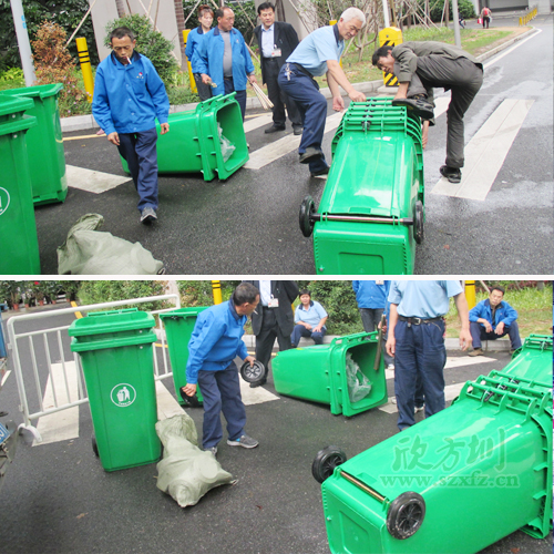 工作人員,塑料垃圾桶分配到各個區域