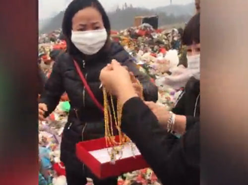 現場視頻顯示,7名女子在一垃圾場中捧著首飾盒正核算尋回的金項鏈數目,其中一黃衣女子倚靠在身旁黑衣女子肩膀上大哭。核算完項鏈數目后,眾人紛紛說道:“好了好了,走了走了。”