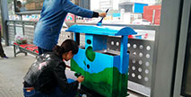 藍天白云清新美麗,可愛卡通天真童趣。鄭州快速公交站臺內兩個原本普普通通的環保果皮箱,經過一番裝扮與改造,成為了兩個別具藝術氣息的環保果皮箱。這兩個環保...