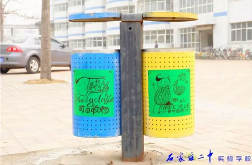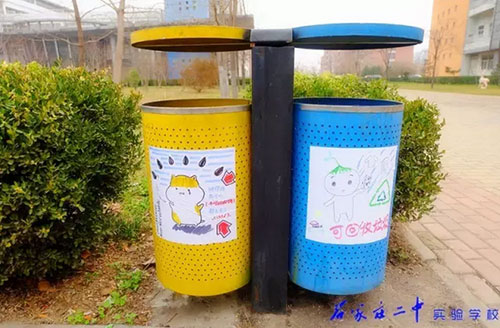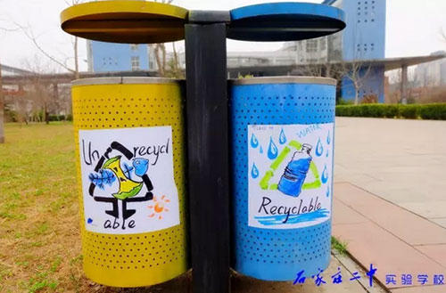 2016年3月18日,石家莊二中實驗學校2015級高一11班全體66名同學利用班級值周的時間,手繪百幅垃圾分類標志,為校園垃圾桶換上了“新裝”。18日上午,高一11班教室內(nèi),66位同學拿起五顏六色的水彩筆,在紙張上設計出各種各樣的“垃圾分類”標識和警示語,內(nèi)容涵蓋了分類標志、垃圾擬人、科普漫畫等,圖面生動有趣。次日下午,同學們又從教室奔向校園每個角落,將精心繪制的圖案張貼在校內(nèi)所有的垃圾桶上,提醒過往師生將垃圾分類,維護我們共同的家園。