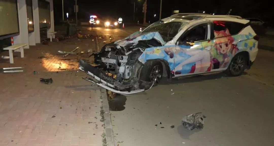 萬幸的是,車上的安全氣囊都及時打開了,盡管車上四人嚇得魂飛天外,但身體都沒啥大礙,只有司機譚某的左手有些輕微擦傷。陳警官趕到現場,只見一輛粵CT××33比亞迪小車打橫??柯愤叄艉婧娴睦隽艘坏?,垃圾桶倒在一邊,交通指示牌和警示樁也被撞得連根拔起,情況比預想的要嚴重得多。陳警官發現,小車車前蓋和兩側車身貼滿了動漫美少女貼膜,但由于撞擊,原本萌萌的美少女此時變得有些猙獰。