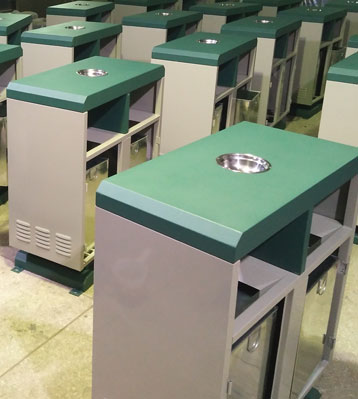 • 產品材質:欣方圳鋼板戶外分類垃圾桶采用優質冷軋鋼材料經剪鈑下料、折彎、沖壓、焊接、打磨、等工藝:表面經過除油、噴砂防銹處理后,再進行酸洗磷化處理;表面清理干燥后整體進行靜電噴涂或烤漆處理,靜電噴涂是經過流水線高溫固化爐固化后再出爐冷卻,加工后的塑粉附著力強,不易剝落;